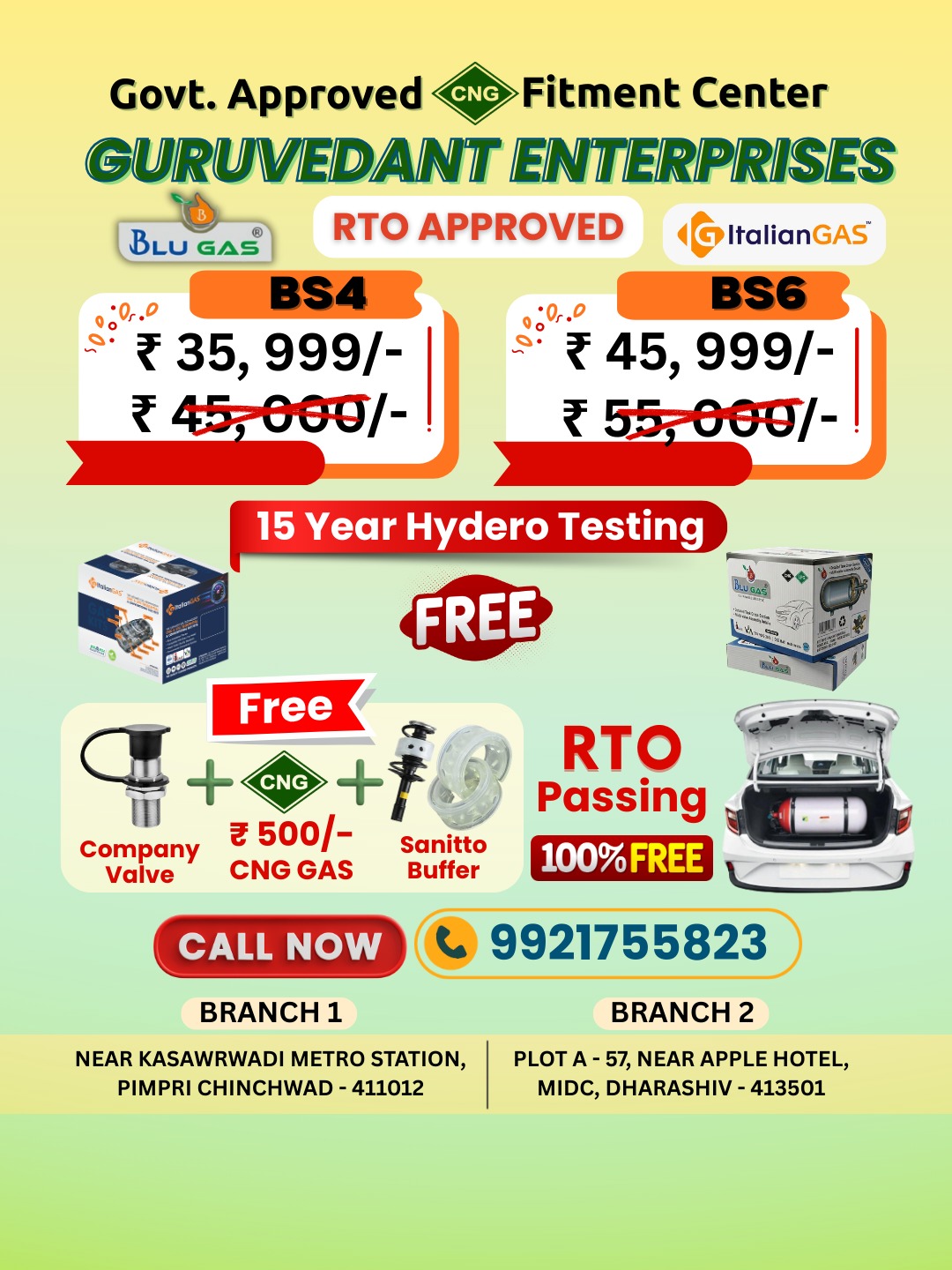 GURUVEDANT ENTERPRISES is a trusted name in the field of CNG solutions, offering a complete range of services to ensure safety, efficiency, and reliability for CNG vehicle users. As a professional CNG fitment center, the company specializes in high-quality installation of CNG kits that comply with industry standards and government regulations. Their expert technicians ensure precise and secure fittings for optimal vehicle performance. In addition, GURUVEDANT ENTERPRISES operates a certified CNG hydrotesting center, where CNG cylinders are thoroughly tested to maintain safety and durability. The company also provides comprehensive CNG service and maintenance, helping customers extend the life of their kits and vehicles. With a dedicated tank testing center, they ensure that every cylinder meets strict safety norms. Their commitment to quality service, advanced technology, and customer satisfaction makes GURUVEDANT ENTERPRISES a reliable choice for all CNG-related needs.